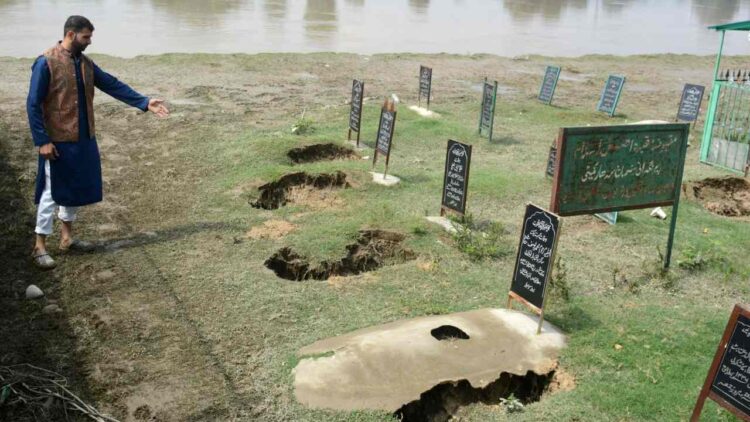 Many graves were partially damaged, battered by gushing floodwaters that entered the low-lying area after the Jhelum swelled, the local said.