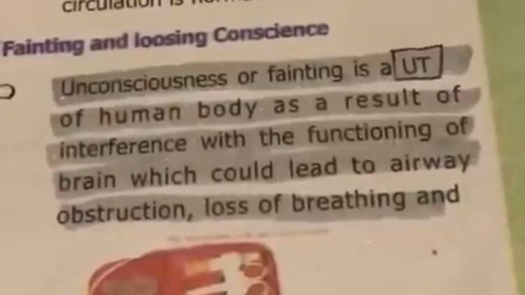 Public outcry erupted after a social media user posted a video on X showing a JKBOSE Class 5 Economics textbook, Disaster Management and Road Safety Education, containing a misprinted sentence: “Unconsciousness or fainting is a UT of Human body.” The correct sentence should have been: “State of Human Body.”