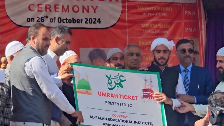Bandipora, Oct 26: Alfalah Educational Institute in Aragam, Bandipora, celebrated a milestone for its Quran Memorization (Hifz-e-Quran) program by awarding an Umrah package to one of its students, Raqib ul Hassan, as a reward for his dedication.